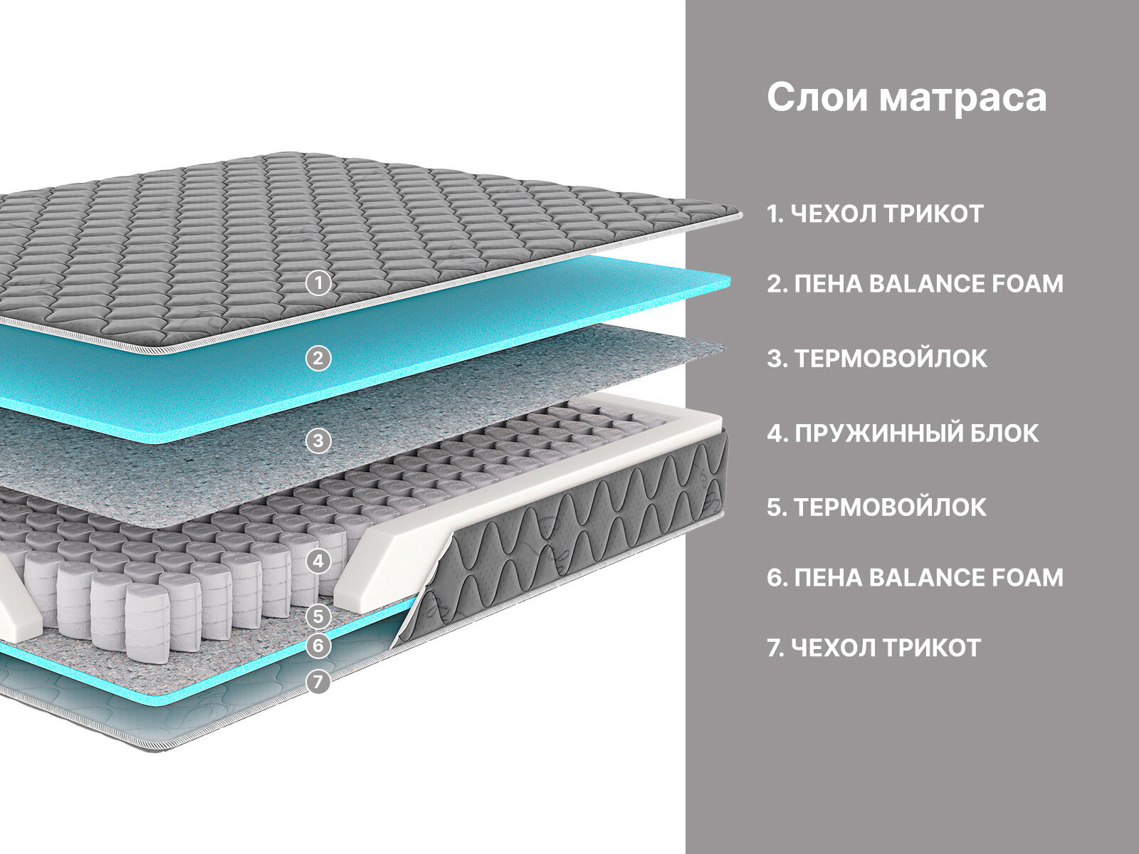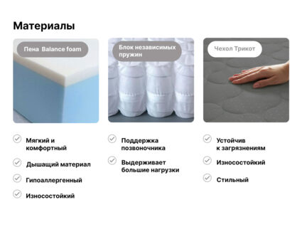 Пена Balance foam – гибкий и пластичный наполнитель. Материал принимает форму тела и создаёт правильную упругую поддержку. Balance foam – сертифицированный наполнитель, подтвердивший свою безопасность не только в России, но и Европе.