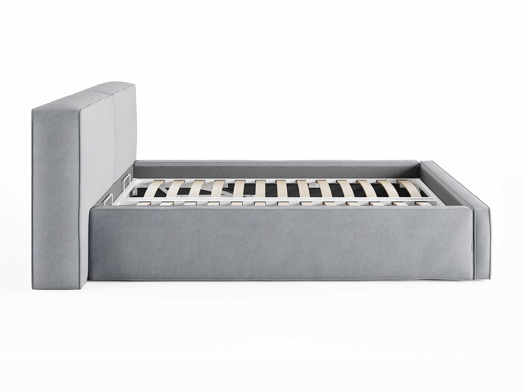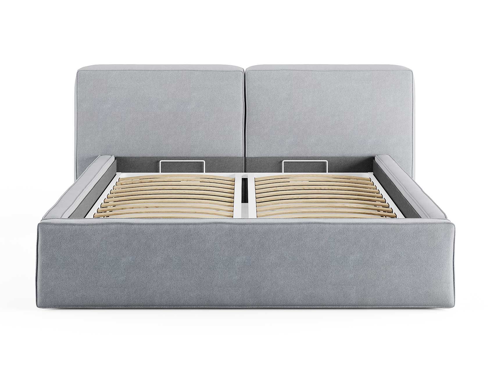 Кровать комплектуется металлическим основанием (без опор), которое имеет 13 рядов встроенных березовых ламелий на каждое спальное место, обеспечивая равномерное распределение нагрузки.