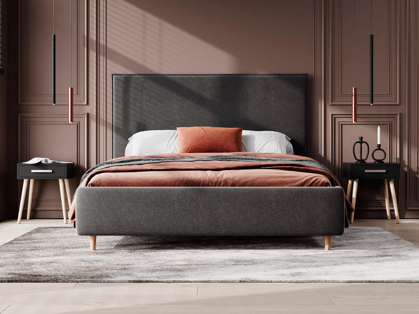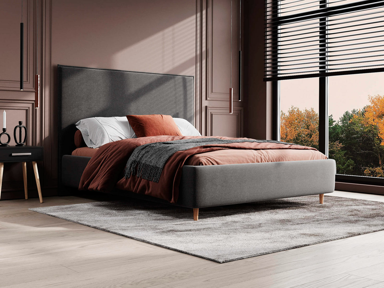 Кровать Eveline для современных интерьеров в скандинавском стиле. Выглядит эффектно благодаря мягкому высокому изголовью с декоративным кантом по периметру и опорам из натурального дерева. Модель будет смотреться выигрышно и актуально в интерьере, делая спальню уютнее, настраивая на отдых.