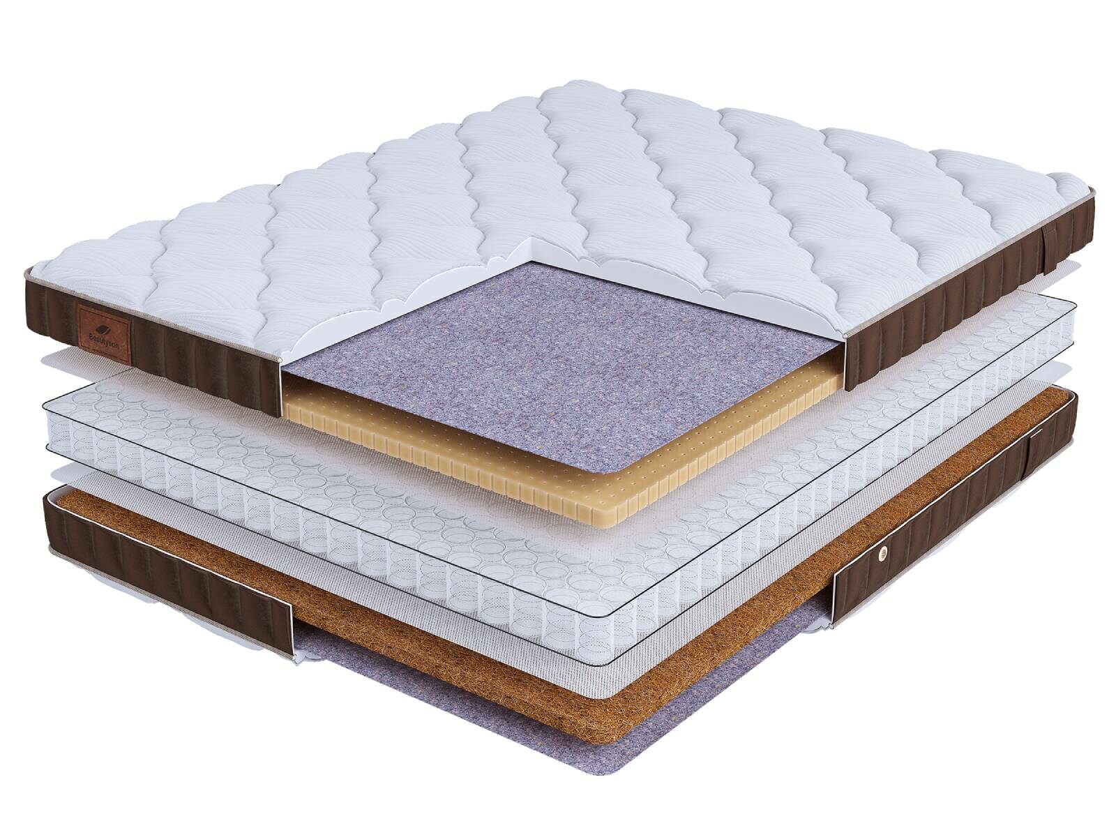 Хлопковая трикотажная ткань чехла обеспечивает комфорт и обладает отличной воздухопроницаемостью. Высокообъемная стежка с использованием холлофайбера (600гр.) подарит дополнительный комфорт спальному месту. Изысканный бурлет из мягкого велюра красивого бежевого цвета придает матрасу роскошный внешний вид и подчеркивает его премиальный статус. Каждая модель серии LIFE украшена фирменной кожаной биркой BeautySon, подтверждающая исключительность каждого матраса.