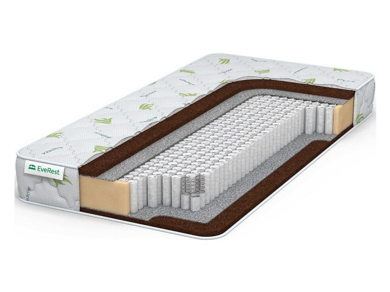 Основным настилочным слоем матраса выступает полотно кокосовой койры. Две одинаковые плиты симметрично устанавливаются по сторонам от блока пружин. В результате обе поверхности спальной принадлежности обретают выраженную твёрдость и равные характеристики.