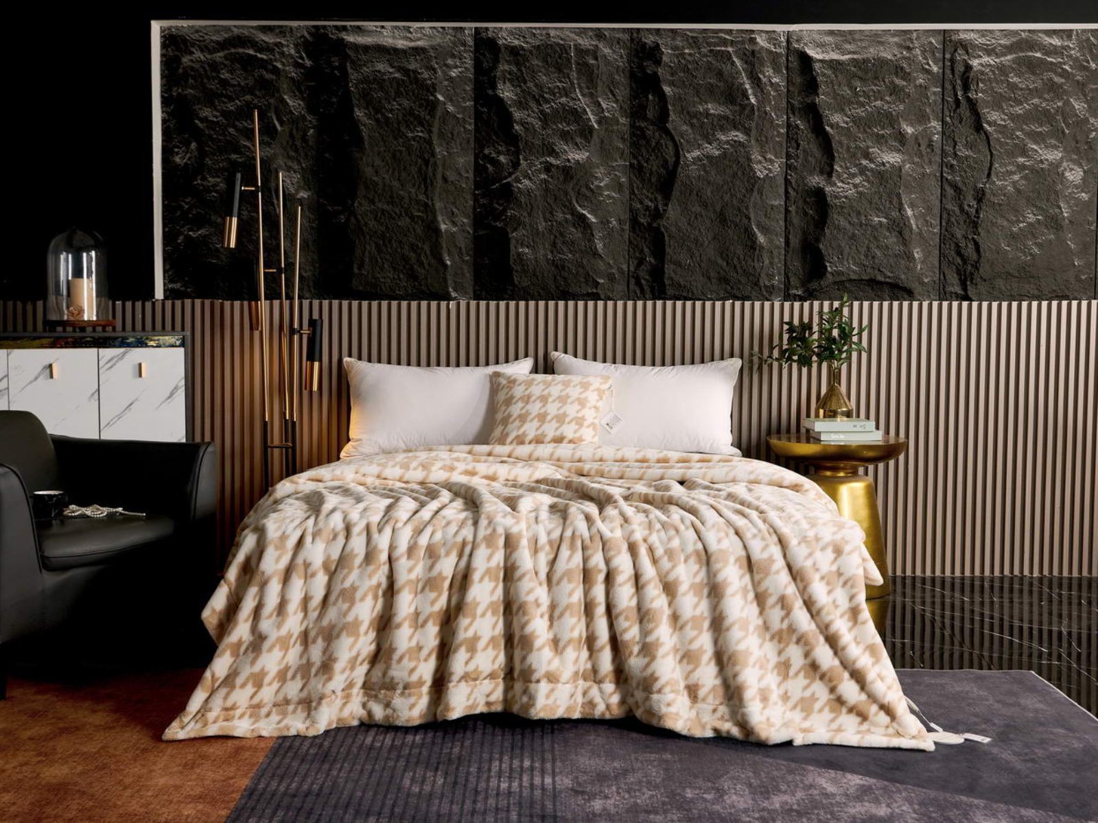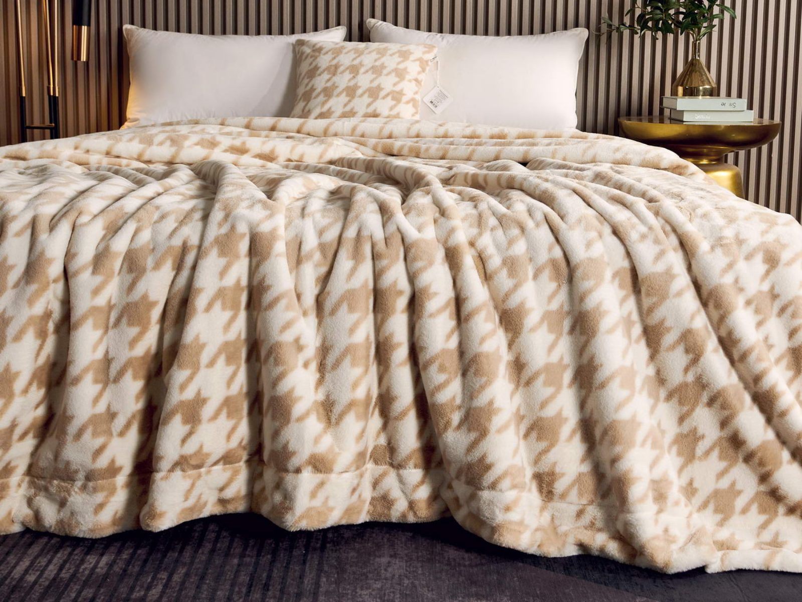 Sofi De Marko представляет вашему вниманию коллекцию Эрнесто, включающую в себя пледы и декоративные наволочки из искусственного меха с принтом «гусиная лапка».