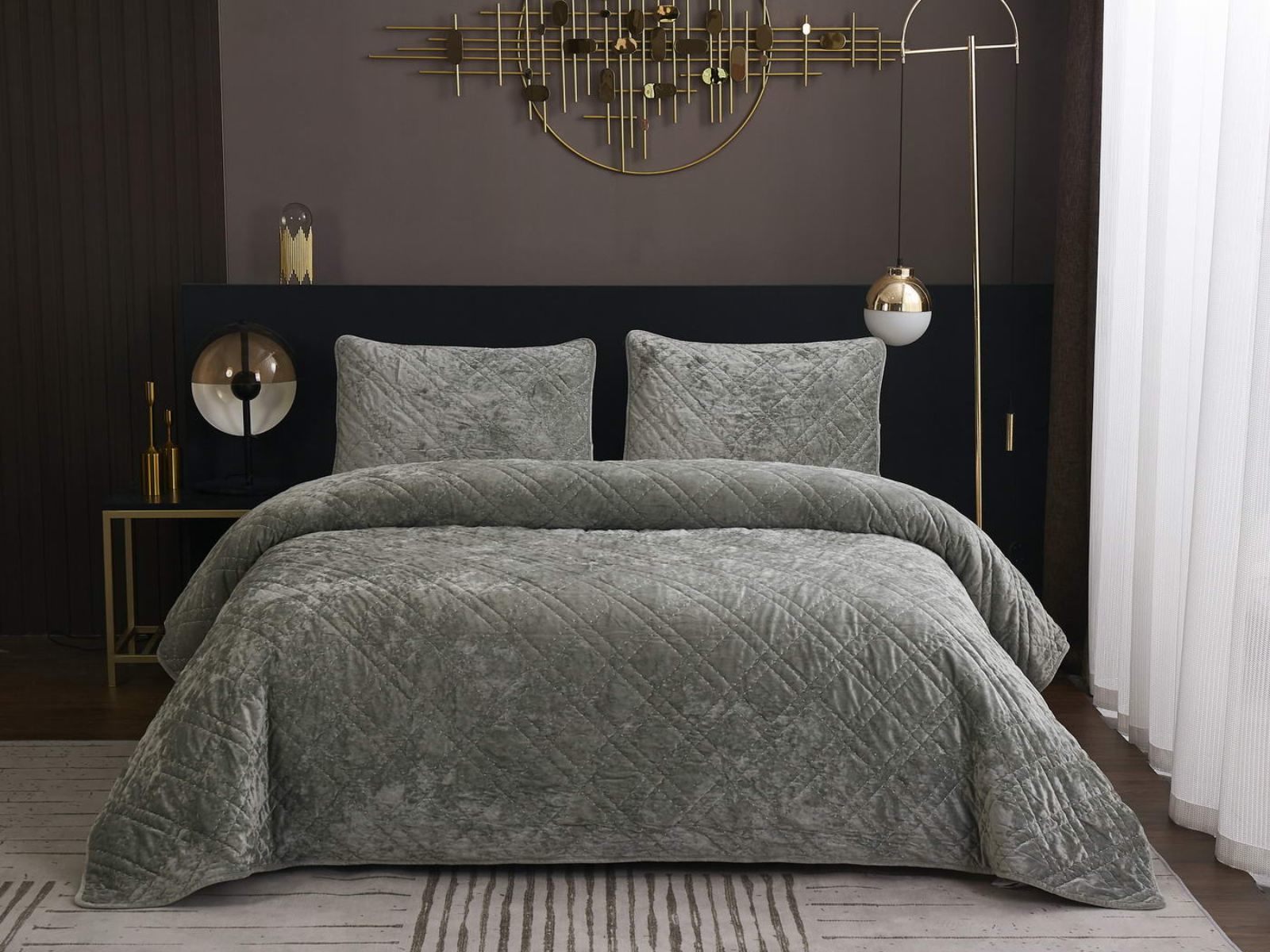 Покрывало Селена выполнено в девяти оттенках: пудра, антрацит, беж, изумруд, капучино, пепел роза, серебро, стоун, терракот. Они подойдут практически для любого интерьера, от классического, до модерна или романтического. Стеганое бархатное покрывало будет необыкновенно смотреться на вашей постели. В комплект входят покрывало и одна либо две наволочки (50х70 см) из аналогичного материала в зависимости от размера.
